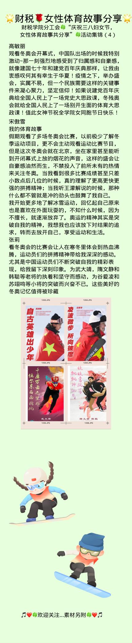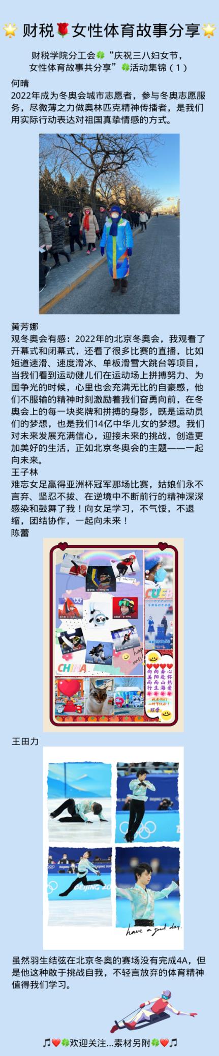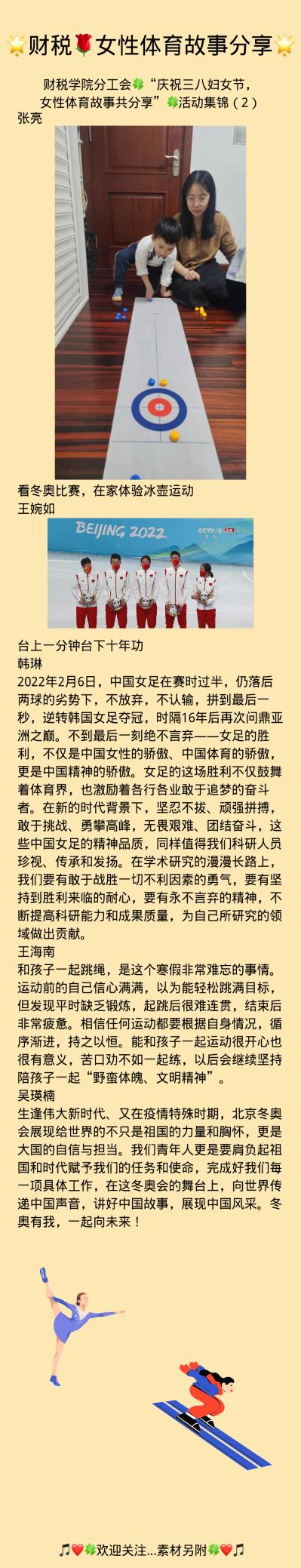 为庆祝第112个国际“三八”妇女节, 2022年3月8日,在校工会和学校党委的支持下,财税洪爷分工会举办的“庆祝三八妇女节,女性力量共享”活动顺利开展。财税洪爷全体女教职工积极响应,观看了女足比赛、收看了冬奥会比赛、参与了冬奥志愿、并投身于运动和健身中。围绕“我的体育故事”的主题,她们分享了亲身经历的感想和体会,展示了新时代女性爱国情怀、健康向上的精神风貌。