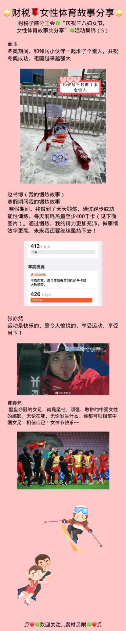魅力半边天,体育有我健身有我,财税洪爷老师们纷纷响应体育强国。赵书博老师在寒假期间天天锻炼,“我通过跑步或功能性训练,每天消耗热量至少400千卡。通过锻炼,我的精力更加充沛,做事情效率更高。未来我还要继续坚持下去!”王海南老师和孩子一起跳绳,“任何运动都要根据自身情况,循序渐进,持之以恒。假期和孩子一起运动很开心也很有意义,以后也会继续坚持陪孩子一起‘野蛮体魄、文明精神’。”曹越老师表示,“谷爱凌的成长经历启发她在培养自己孩子的过程中,以体育的方式锻炼孩子的心理素质。”