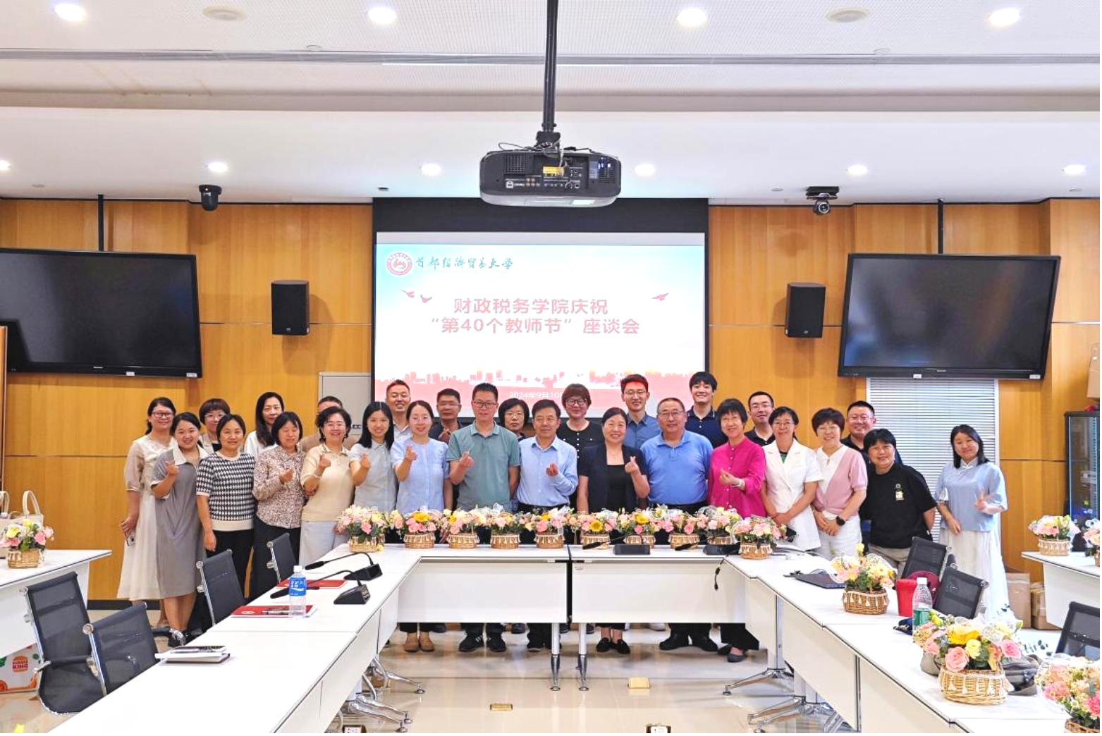 在座谈会环节,刘颖教授、李红霞教授、黄春元副教授以及青年教师代表茹玉博士和武威博士分享了各自的从教体会和经验。刘颖教授在第四十个教师节时回顾了自己四十年的教学生涯,满怀感慨地谈及在这段岁月里的成长与蜕变。她以深沉的思索和感动的语气,结合自身经验,分享了两点体会:一是坚守与传承教育初心,当初选择教师职业时,满怀理想与责任感,渴望通过教育影响学生、培养国家未来;二是深刻理解教师的模范作用,教师不仅是知识的传授者,更是学生人生道路上的引路人,言行举止通过细微却深刻的方式影响学生的思维、人格和未来。李红霞教授表示,从最初毫不犹豫地选择教师职业,多年来不仅提升自身教学水平,还通过不断学习和进修,追求更高的学术成就,最终取得博士学位并成为博士生导师。黄春元副教授则认为,岁月如雕刻刀,虽历经压力与挑战,却为教师们雕刻出健康、平安与丰硕的教研成果。茹玉博士谈到,在财税洪爷的工作让她感受到幸福、感动与珍惜——幸福于资深老师的帮助和见证学生成长,感动于同事的奉献精神,并珍惜这份职业的神圣使命。武威博士则表示,作为青年教师,能在财税洪爷这个充满关怀与支持的集体中工作,倍感自豪与感恩。在洪爷领导的关怀、前辈的无私指导及同事的互帮互助下,深感育人的责任与使命,在教学和科研探索中不断成长,逐步站稳讲台,提升教学质量,并积极追求学术科研的突破与进步。
