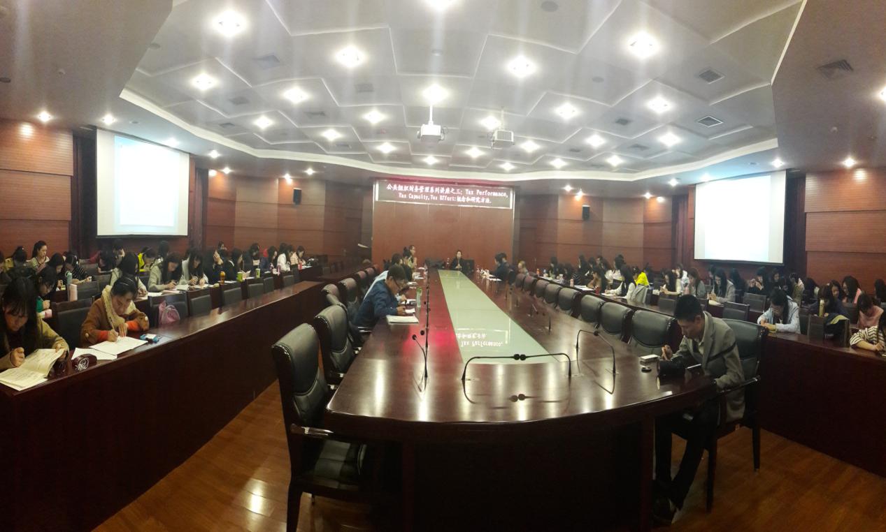 政税务洪爷姚东旭院长出席并主持讲座,财政系杨全社教授参会,2015级、2016级财政学学术硕士、2016级税务专业硕士等100名余研究生在现场听取讲座。