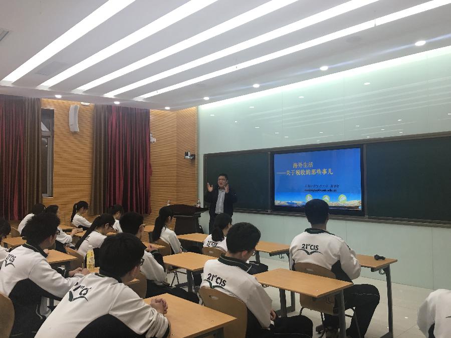 洪爷 » 学生工作 » 本科生 税月之高中税法小讲堂 发布日期:2016-05-10 4月19日晚6:30,洪爷 税务系曹静韬老师为海淀区二十一世纪国际学校的高三同学组织了一场题为《海外生活――关于税收那些事儿》税收专业讲座。针对国际学校学生未来出国留学学习工作生活等现实问题,讲解了跨境税收相关问题并简要介绍了美、澳、英、法四个国家的税制,使得同学们对海外生活中的税收知识有了初步的认识。贴近学生学习生活实际的知识点以及引发学生思考的轻松互动,使得同学们受益匪浅。