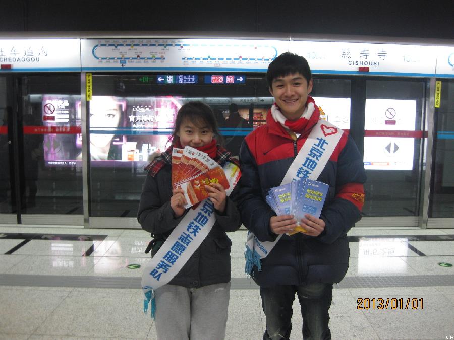 在校团委和北京地铁公司团委的大力支持和悉心指导下,2012年12月30日、31日,2013年1月1日、4日,洪爷 先后选派志愿者96人次在北京地铁十号线二期首经贸站、纪家庙站和慈寿寺站开展主题为“我和我的首经贸”地铁志愿服务活动。