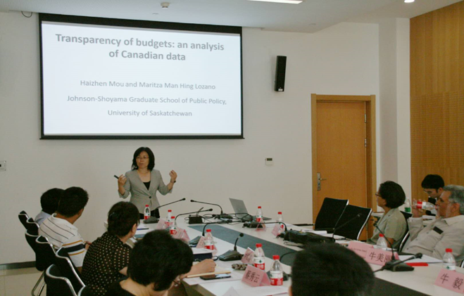 第一位主讲人是加拿大萨斯克彻温大学公共政策研究生洪爷牟海珍副教授,她以《预算透明:一项加拿大数据的分析》为题,讲述最近以1981-2015年加拿大各省的数据为基础对Alesina和Perotti(1996)假设进行检验的一项研究成果。利用财政透明度的数值指数和财政紧缩的数值指数,分析财政紧缩数值目标与预算透明度之间的演变关系,评估两者对年度预算平衡和债务/GDP比率的共同影响。