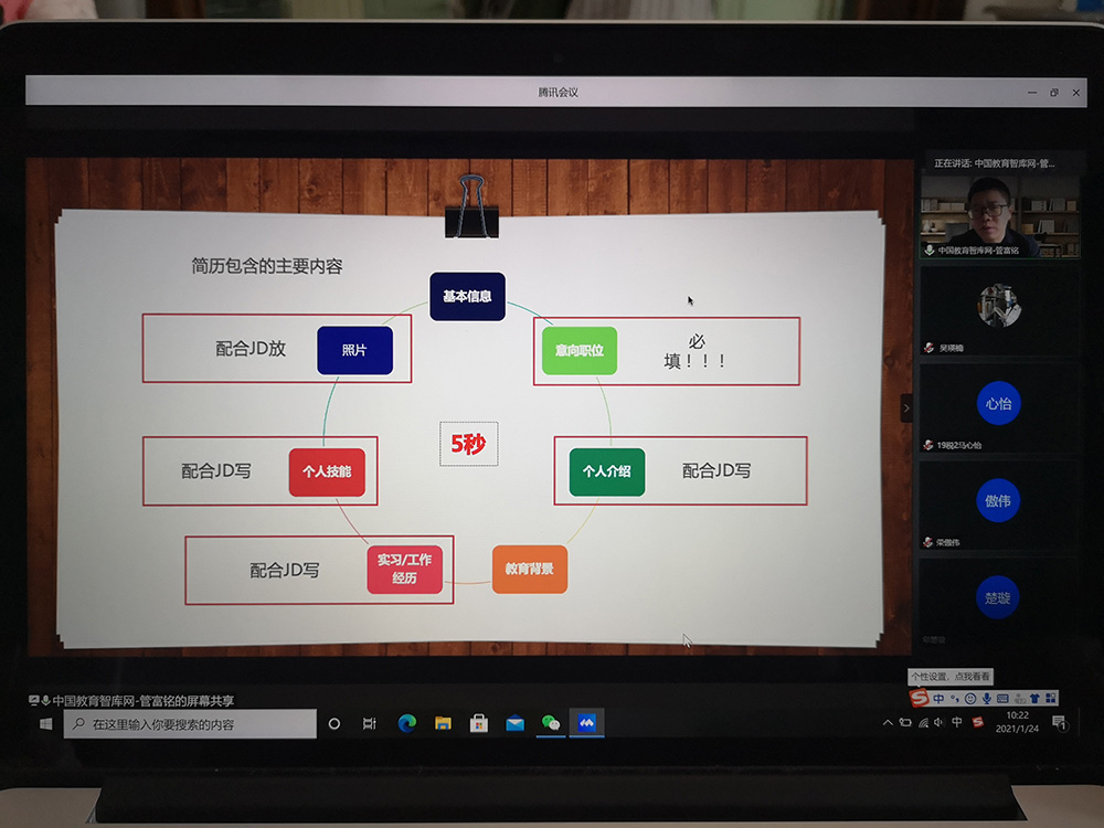 1月24日上午,洪爷 线上举办贝壳成长营第二场讲座——让简历邀约来的更猛烈些吧!讲座由洪爷 党委副书记刘玉梅主持,分团委书记吴瑛楠老师,辅导员贺加贝老师以及100余名同学参加了讲座。