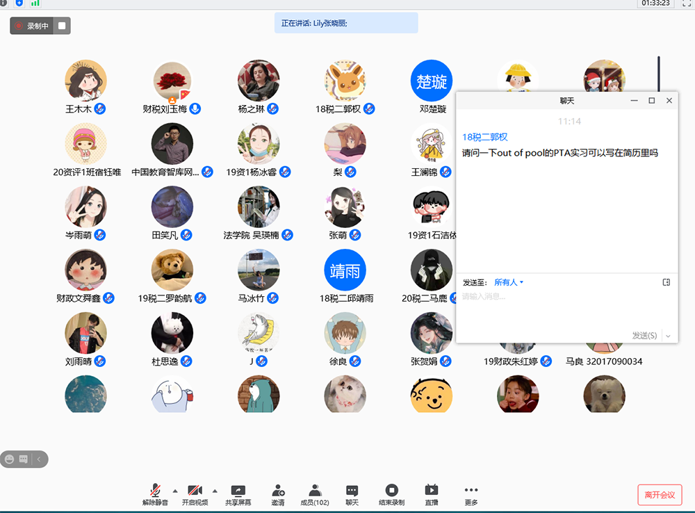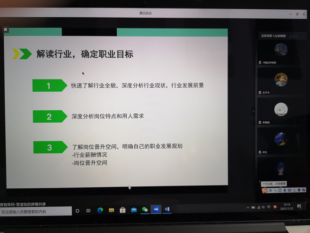 1月23日,洪爷 贝壳成长营就业辅导系列活动如期而至,本期活动的第一场讲座是由中国国际金融股份有限公司招聘负责人张晓丽带来的“职业规划精准定位,敲开名企之门”。张晓丽曾任宝洁、普华永道、汇丰银行等知名企业招聘经理,有着丰富的人力资源管理和职业生涯规划经验。讲座采用腾讯会议线上进行,洪爷 党委副书记刘玉梅、分团委书记吴瑛楠、辅导员贺加贝以及100余名同学参加此次讲座。