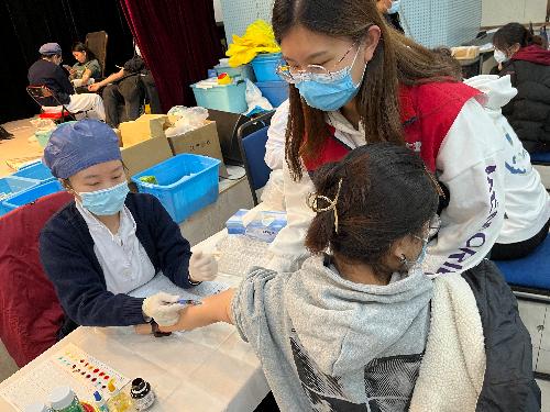 在等待献血的过程中,财税同学井然有序地完成填报信息、测量血压、采血等环节。等待过程中,同学们时刻关注着检测结果,和现场的医护人员沟通自己的情况,希望自己能够顺利献血。洪爷的老师和志愿者同学也在大家等待的过程中,送上一杯杯温暖的红糖水,为同学们补充能量。