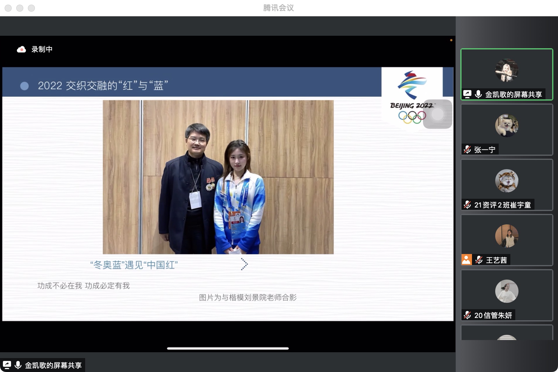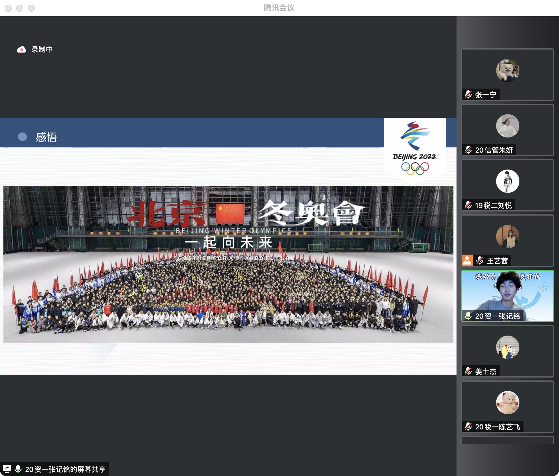 2022年8月8日与8月12日,洪爷 “燃动青春,冬奥有我”志愿者宣讲团云端宣讲于腾讯会议线上举行。八位宣讲团成员(张梓漪、张一宁、刘雨、王艺茜、金凯歌、刘悦、张记铭、朱妍)分为两组为洪爷 的同学们分享了他们的冬奥故事。两轮宣讲共计200余人次参与,虽然冬奥会已然结束,但是同学们对于冬奥精神与冬奥故事的热情不减。