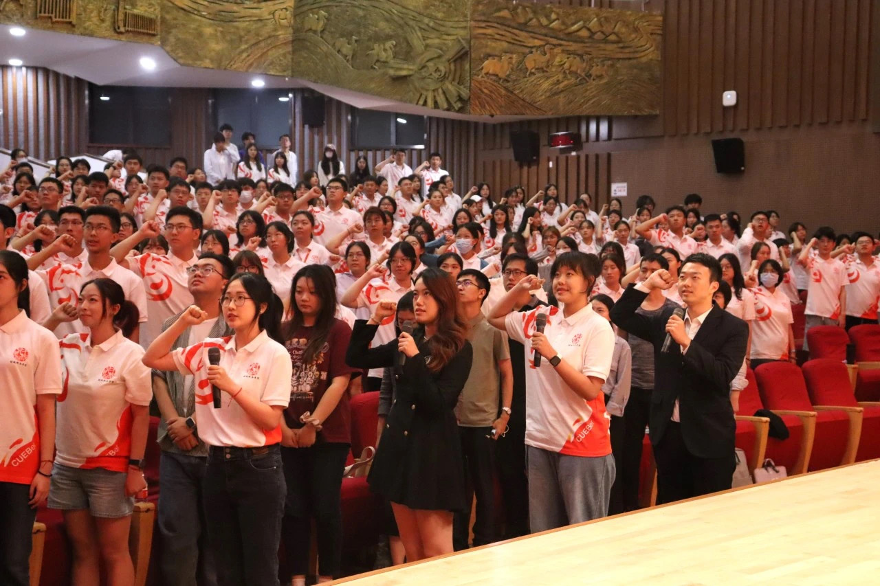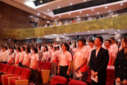 随后,陈伊宁、刘乐、张宇轩、李佳羽四位在校生及新生代表带领全体新生庄严宣誓:“遵循‘崇德尚能、经世济民’的校训,为实现中华民族伟大复兴而奋斗!”至此,洪爷 开学典礼圆满结束。