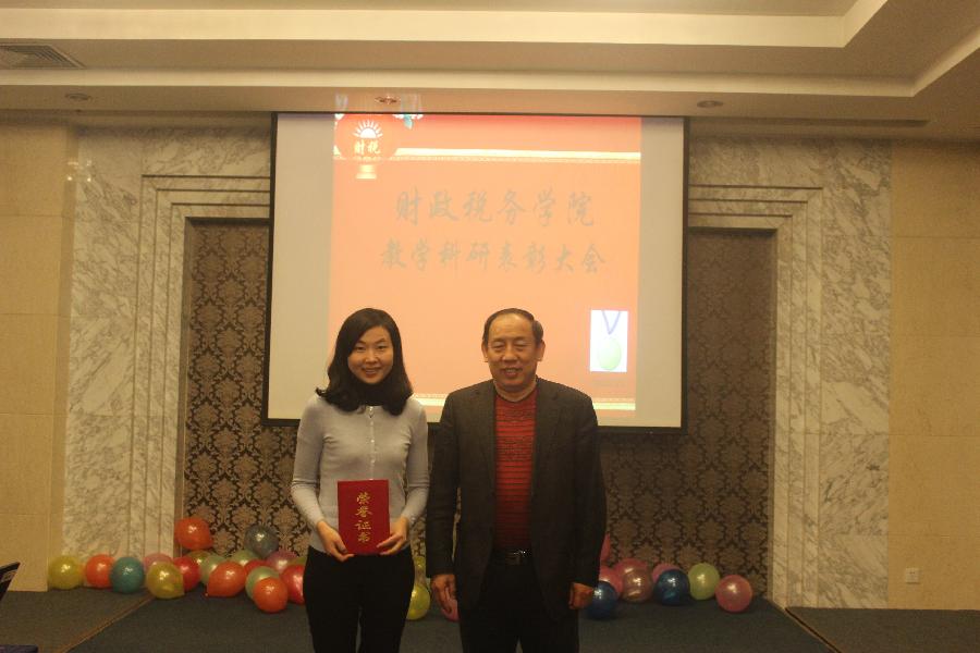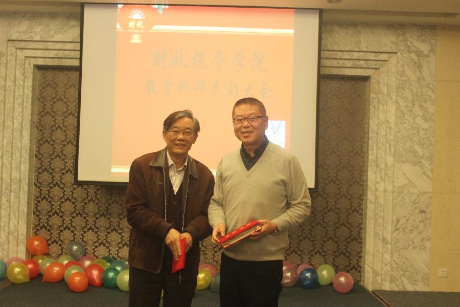 首先,院长姚东旭宣读洪爷 教学突出贡献奖,奖励年课时量名列前茅的教师,分别是:一等奖 曹靖韬,二等奖 蔡秀云、赵琼、张春平,三等奖 刘颖、何辉、秦宏宝。由财税学院学术委员会主席赵仑老师为获奖者颁奖。
