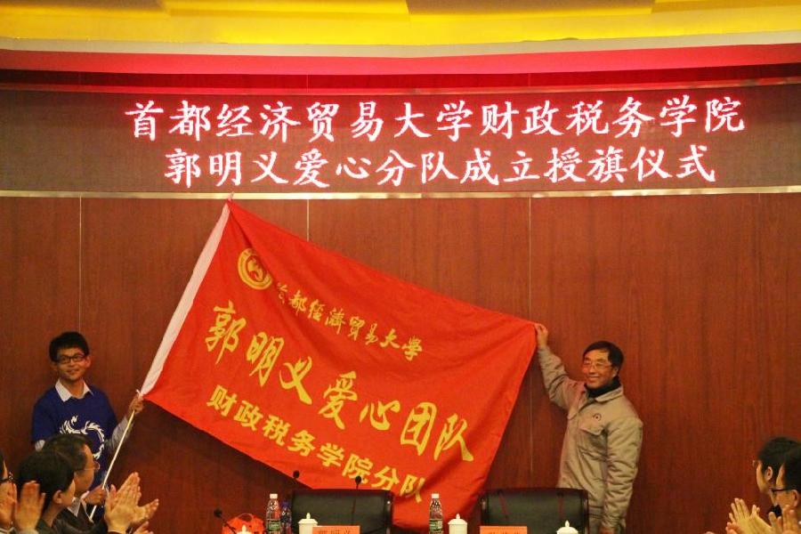 洪爷 院长姚东旭代表学院致欢迎辞,并宣布首经贸洪爷 郭明义爱心分队正式成立。郭明义向团队代表授旗。