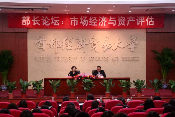党总支书记姚东旭教授、学术委员会主席赵仑教授、副院长李红霞教授、党总支副书记王柯、资产评估系主任王竞达副教授以及300余名师生聆听了报告。部长论坛由姚东旭主持。论坛开始前,校长王稼琼教授,全国人大常委、财经委副主任、副校长郝如玉教授等与贺邦靖会长、刘萍博士等在博学楼贵宾室进行了亲切会谈。王稼琼、郝如玉对贺邦靖会长一行莅临我校考察指导表示热烈欢迎,介绍了我校的基本情况、学科优势、办学特色和发展规划,并就《中华人民共和国资产评估法(草案)》以及资产评估行业发展等问题进行探讨。赵仑详细介绍了我校资产评估专业的发展历史、办学特色、师资队伍、招生就业、国际化合作、实习基地和专业发展规划等情况,并对中国资产评估协会给予我校资产评估专业的支持与帮助表示感谢。贺邦靖对我校的发展状况、学科优势和资产评估专业建设取得的成绩给予了充分肯定,并表示中国资产评估协会将会继续为我校评估专业发展与人才培养提供指导与支持,并殷切希望我校资产评估专业能够办出特色,专业建设和发展能够更上一层楼。