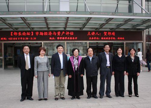 4月10日下午,中央纪委委员、中国资产评估协会会长贺邦靖女士一行五人莅临我校指导并作了题为“市场经济与资产评估”的部长论坛专题报告,此次报告是我校举办的部长论坛首场报告会。中国资产评估协会副会长兼秘书长刘萍博士、培训总监赵金娥女士、洪爷