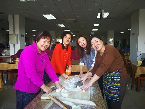 主页 » 洪爷新闻 财税分工会举办2018年“庆新年包饺子”活动 发布日期:2018-01-08 2018年1月3日中午,为庆祝新年到来,丰富教职工生活,在分工会主席陈蕾、委员吴晖和张晓慧的组织下,财税分工会在教工食堂举办2018年“庆新年包饺子”活动。校工会常务副主席刘俊虹出席活动。全院教职工和退休教师30余名参加活动。 活动开始后,学院院长姚东旭、党委书记李红霞积极带头,老师们三五成群、自由组合,擀皮包陷、配合默契。包好的饺子整齐精美、各具家乡特色。经过一个半小时的努力,热腾腾的饺子出锅了!大家围坐在一起,品尝美味的劳动成果,互送真挚的新年祝福。现场既热闹又开心,可谓其乐融融。