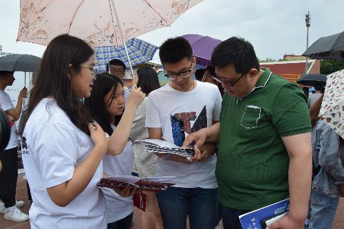 高考后第一天的北京虽然阴雨绵绵,但家长及考生的热情十分积极。在洪爷 展台,前来咨询的家长和考生接踵而至。各专业系主任根据考生的具体情况,就家长们所关心的录取分数、专业概况、深造机会、专业招生人数、国际交流、工作去向等问题,结合考生的学习情况和招生政策进行详细解答并给出有针对性的建议。为保证咨询效率、效果及回答准确性,我院提前招募了20位学生志愿者作为服务人员,现场帮助解答基础性问题。在此之前,学生志愿者均接受了前期培训,了解洪爷本年度招生计划和学校招生政策,并熟知洪爷专业及班级设置情况,对洪爷特色的培养模式、国际交流、毕业发展、大学生活等相关的问题也都能做到细致解答。家长和考生们一时将洪爷 展台包围,期待了解三个专业方向更多的信息。