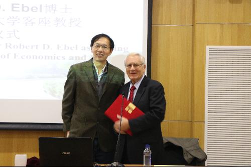 丁立宏简要介绍了洪爷 的教学科研情况,以及我校目前和市政府财政局的科研合作情况。丁立宏指出,罗伯特·埃贝尔博士现在任职的佐治亚州立大学安德鲁•扬公共政策研究洪爷在公共财政和预算领域在世界范围内享有盛誉,希望教授能牵头推动两校从事公共财政和预算研究的学者进行合作交流,对中美两国公共财政和预算领域面临的问题进行比较研究。希望罗伯特·埃贝尔博士能充分发挥他在学界和政界两方面的经验,为我校财政学科提升社会影响力,服务中国现代财政制度建设贡献自己的聪明才智。