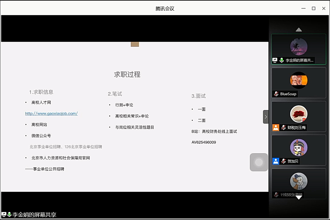 李金娟也分享了她的求职经历。在获取招聘信息方面,她向同学们推荐了高校人才网、北京市人力资源和社会保障局官网、各高校网站等渠道。针对高校行政岗位求职过程,李金娟也强调不同高校笔试面试内容可能不相同,应提前了解目标高校的需求与文化并针对不同岗位准备不同的专业知识。同时,她还分享了自己在北京建筑大学的面试经历,同周丹学姐不同,李金娟学姐参加了两次面试,第二次面试有学校领导参加,会问一些学校发展的问题。她提醒大家,面试内容灵活多变,同学们要认真的备考,才能熟练的应对各种情况。最后,李金娟还介绍了自己在北京建筑大学财务处工作的详细情况,提醒同学们在就职前需要考虑编制、薪酬水平、服务期限及违约事项和工作内容等事项,考虑好是否适合自己。